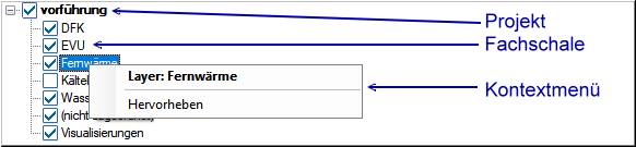 Der Layermanager Abb. 47, zu erreichen über das Register Fachschalen und Layer unterhalb des Übersichtsfensters, liefert einen Überblick mit Hilfe der Baumstruktur über die Fachschalen und Layer des für den aktuell angemeldeten Benutzer zur Verfügung stehenden Projekts.